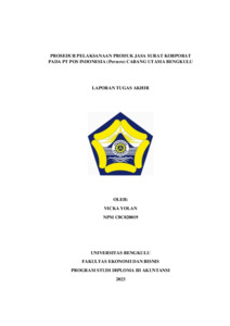 Yolan, Vicka and Novitasari, Novitasari (2023) PROSEDUR PELAKSANAAN PRODUK JASA SURAT KORPORAT PADA PT POS INDONESIA (Persero) CABANG UTAMA BENGKULU. Diploma thesis, Universitas Bengkulu.